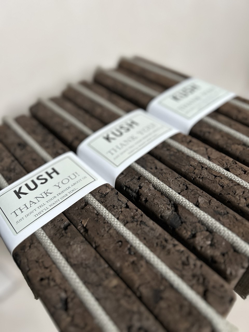 The KUSH Sauna Mat is where our story began. Each mat is carefully assembled by hand, with cork slats individually placed and secured to a base of Belgian linen. The dark cork provides gentle cushioning and natural moisture resistance, while the linen offers breathability and softness. This is a mat designed for longevity—built to be part of your ritual for years to come.